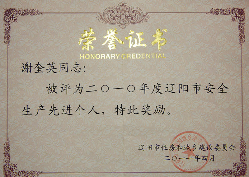 2010年度遼陽市安全生產(chǎn)先進個人