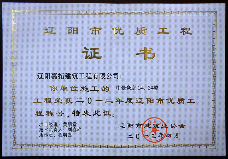 中景豪庭榮獲2012年度遼陽市優(yōu)質(zhì)工程稱號